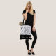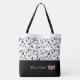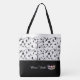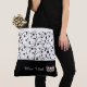 This lovely fashion forward tote bag shows a gleaming Silver crown and your personalised name/title/pageant at bottom over Black with the upper tote bag in White with Black vines and scrolls all over. Graphics and text are on both sides of this tote bag. Black handle. Customise further or buy as shown.