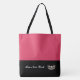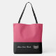 This cute stylish large tote bag is shown in a Geranium Pink and Black colour block style with a pageant crown and custom text.