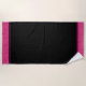 This beach towel is shown in a Black towel with ends in Pink faux glitter colour and a coordinating solid stripe.