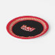 These pageant festive paper plates are great for serving up some fun (and easy clean up too) for your next pageant get together. Add your pageant theme or pageant name if desired. Shown here is a bright Red rim and a gleaming Coral-Red crown print in the centre over chic Black background. Gold coloured regal trim on the rim. Personalise or buy as designed.