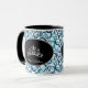 This two-tone mug has a black handle and black interior. Blue colours swirl background over white mug features ovals on each side with a grey-silver like coloured pageant tiara crown in the centre of the ovals bordered by grey. Personalised text underneath each crown for you to customise. Text sample shown in "Miss Montana".