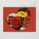 Colourful rose and daisy flower bouquet photograph cut into a jagged edged heart shape over an orange textured background on the front. The bouquet is on the back in a diminished opacity photograph of the entire bouquet. Personalise the template text, remove text or click customise to select a font style, size and colour you prefer.