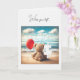 A brown teddy bear with a red balloon is sitting on the beach in a jigsaw puzzle design with one piece missing on soft white textured background.