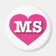 This magnet features a vibrant hot pink heart containing the bold, white, upper case letters MS, the official abbreviation for Mississippi, the magnolia state.