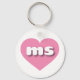 This key chain features a vibrant pink heart containing the bold, white, rounded lower case letters ms, a playful abbreviation for  Mississippi, the Magnolia State.