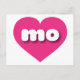 This product features a vibrant hot pink heart containing the bold, white, rounded lower case letters mo, a playful abbreviation for the state of Missouri.