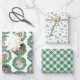 Mistletoe themed wrapping paper sheet set for Christmas with three matching patterns: one with your photos inside mistletoe wreaths; one with green mistletoe twigs; and one with a green and white plaid pattern.