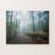 This photo features a pathway through a dark foggy wood in Norfolk, UK.
