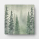 An ethereal and atmospheric digital painting or illustration depicting a dense coniferous forest shrouded in thick mist or fog. The tall, slender pine and evergreen trees create layers of depth, with the foreground trees showing more distinct detail and deeper shades of green, while the trees receding into the background fade into soft, pale, and desaturated hues of sage and grey. The overall mood is calm, mysterious, and tranquil, evoking the feeling of a quiet morning deep in the wilderness.