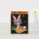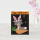 Misty's a grey cartoon cat in an adorable pink bunny costume, complete with rabbit ears and tail. She's sitting on a carrot cushion that's placed in front of a dark haunted house with a few lights, and a brown owl is perched on it. Trick or Treat! The background can be any colour.