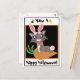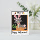 Misty's a grey cartoon cat in an adorable pink bunny costume, complete with rabbit ears and tail. She's sitting on a carrot cushion. Trick or Treat! The background can be any colour.