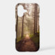 Atmospheric photograph of a path winding through a forest of tall trees. Great photo to add an inspirational quote.