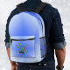 This backpack has a peace sign design on the front pocket circles with fancy scrolls in blue green and pin and bordered with bright pink shooting stars. The backpack is done in a mixture of shades of blue in light and dark blue tones.
