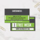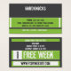 Mixed Martial Art Business Card Free Week Card business card with a green and dark grey colour scheme, modern design scheme, and strong typography elements. Back of card has free week placeholder. Space to add your classes, gym hours, or any other pertinent information. Perfect way to encourage class participation and an easy marketing tool. Perfect for a mixed martial arts gym, boxing gym, kickboxing gym, krav maga, or martial arts studio.
