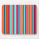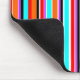This mouse pad has a simple design of vertical stripes of varying thicknesses in red, orange, purple, black, light blue, and white.