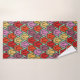 This towel set has an art deco design of tulips from pentagons and trapezoids in orange, red, purple, gold, and green.