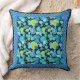 A Throw Pillow or Cushion with a 'Blue Moons' abstract pattern in bright blues and neon green on a black background, bordered by a coordinating Polka Dot pattern. Part of the Posh & Painterly 'Blue Moons' collection; from a handpainted paper collage design by Judy Adamson.