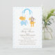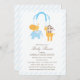 This baby shower invitation features a safari animal mobile on a very light blue striped background. Graphics ©Blackleaf Design.