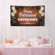 Fun banner sign for indoors or out, featuring festive gold metallic balloons on both sides of the design with sparkly, gold metallic confetti on a rich, warm shade of a mocha brown textured background for your personalised retirement party banner.