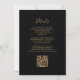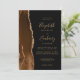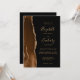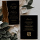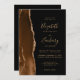 The left-hand edge of this elegant modern wedding invitation features a mocha brown watercolor agate border trimmed with faux gold glitter. The customisable text combines gold-coloured handwriting, copperplate and italic fonts on a black background. The reverse side provides space for wedding details on a solid black background, along with a QR code guests can scan to visit your website and RSVP, which saves the cost of printing and mailing separate RSVP cards.