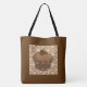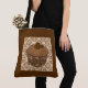 Printed tote - Cupcake with mocha frosting topped with chocolate covered coffee beans, in a decorative, chocolate brown and tan cupcake wrapper, on a light chocolate and beige lace patterned background
