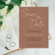 Simple, foil print wedding Save the Date card with black, stylised script on a trendy mocha brown colour background. Edit names and date, etc, with your own wedding information. Change foil colour if desired. Background colour may be changed as well to match your wedding colour scheme.