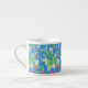 A pretty Espresso Mug with creamy white Mock Orange and bright pink Weigelia on a sky blue background from a handpainted design by Judy Adamson.