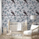 This wallpaper features a pattern of a bird standing on the branch of a tree.