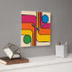 A dynamic abstract composition featuring two bold circles—one blue, one green—linked by three flowing bands in orange, magenta, and yellow. Each stripe is bordered by crisp lines, curving gracefully across a soft beige background. The interplay of shape and colour evokes 1970s graphic design, balancing visual rhythm with sculptural simplicity. The result is a harmonious, retro-inspired piece that captures motion, contrast, and editorial clarity.