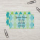 These business cards feature a preppy argyle pattern in teal, light blue and spring green with black contrasting "stitches" on a pale green background. The black script text says "thanks," but you can change it to whatever you'd like, or remove the strip and text altogether. Look for other Mod Argyle designs in our gallery.