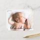 Personalised this baby announcement postcard with baby photo on the front with a modern "thank you" scirpt. And include baby's birth date, full name and special message on the back. Modern typography and design. Customise the return address field and thank you message too. Make it easy and thoughtful to send out your baby birth announcement to family and friends. Let them share the joy.