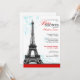 Elegant and modern Parisian Baby Shower invitations with a grey-scale Eiffel Tower atop a red bottom border with aqua blue flourishes behind it.