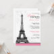 Pink Invitations: Elegant and modern Parisian Bridal Shower invitations with a grey-scale Eiffel Tower atop a pink bottom border with light grey flourishes behind it.