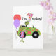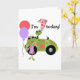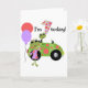 Mod Frogs 1st Birthday design featuring lots of polka dots, ballons, a cool green car, and green frogs!
