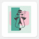 Cute young woman bent over the handlebars of a scooter as it speeds along its way. Background is a retro feeling design in teal and pink