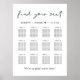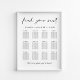 Modern downloadable wedding seating chart poster sign for up to 12 tables featuring "find your seat" in a chic script, your names and wedding date joined together by a heart and "We're so glad you're here" in classic serif typography. You can select the digital download option to edit with last minute changes and print locally.