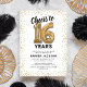 Elegant 16th birthday party invitation featuring a simple white background that can be changed to any colour, gold sparkly glitter, sixteen gold hellium balloons, and a modern 16th birthday celebration text template that is easy to personalise.