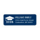 Modern custom address label design features a white grad cap with tassel, class year, return address text and navy blue background colour that can be customised to match any school or invitation colours.