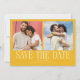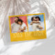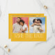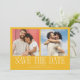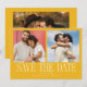 Simple and modern wedding save our date card featuring a text that says "SAVE THE DATE." 2 photos on the front and one on the back. The background is yellow.