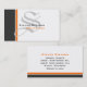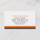 A white background with a large charcoal coloured stripe and a smaller orange coloured stripe on the left hand side of the card. In the centre of the card is a large initial in soft grey. Your name and title is on the front and all other information is on the back.