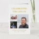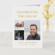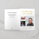 Folded white and gold funeral program printed with a small photo collage of your loved one, their name and years living, obituary, and order of service. Add acknowledgements to the back. Celebrating the life of in bold golden letters.