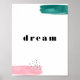A simple abstract art work paired with typography, perfect to be framed for any space in your home. This design features watercolor brushstrokes in pink and teal and splatter in black. In the centre is the word "dream" in modern black font. The centre word is editable.