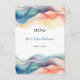 Modern Abstract Wedding Menu designed with a bright colour wave both front and reverse. The front text includes: WEDDING MENU, The Bride and Groom's Names and Wedding Date, on a white background. The reverse text includes: Menu Selections, along with your Appetizer, Entre and Dessert Selections, accented with a diagonal colour wave on a deep blue background. To personalise this menu, simply insert your Appetizer, Entre and Dessert Selections into our easy template, replacing the sample text. Be sure to view the entire Modern Abstract Colour Wave Wedding Collection for matching cards and accessories.