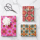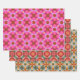 This set of three wrapping paper sheets presents a vibrant and captivating display of geometric artistry. Each sheet boasts a unique, kaleidoscopic pattern that is sure to add a touch of elegance and intrigue to any gift. Dominated by a warm pink hue, the first sheet features intricate geometric shapes that come together to form star-like patterns. The design is reminiscent of a kaleidoscope, with its symmetrical patterns and mesmerising array of colours. The middle sheet is a riot of colours, with reds, oranges, greens, and blues coming together in complex symmetrical formations. The design, which resembles a floral or star pattern, is both intricate and visually striking. The third sheet combines elements from the first two designs, featuring similar geometric shapes but with an expanded colour palette that includes greens and blues. This sheet is the most colourful of the three, offering a harmonious blend of symmetry and colour.
