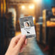 Company employee identification badge with templates created for you. Background is a modern abstract in silver grey.