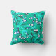 Throw pillow in a Mid-Century Modern abstract pattern of spirals and dots, with the look of confetti tossed in the air, in shades of aqua, cobalt blue, charcoal grey and white, against a turquoise / peacock background