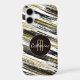 Here's an elegant abstract design that resembles paint brush strokes in black, gray, and white, combined with faux gold glitter embellishment. The stripes are placed diagonally across the surface of the case. At the center is a gold lined black circle banner with your monogram in gold, and your name in white script. Eye catching! *Abstract pattern by ThingsByLary.