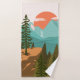Introducing our Modern Abstract Forest, Mountains, and Sunrise Bath Towel Set. Featuring landscape illustration in vintage style. Suitable for as a gift for nature, hiking, and camping lovers.