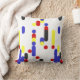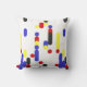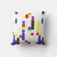 This modern pillow features abstract pattern with geometric shapes in yellow, blue, red, and black on white background.