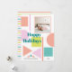 Modern abstract geometric shapes blush pink, teal blue photo Holiday Card. It features abstract geometric shapes in blush pink, coral, chartreuse green and teal blue, a photo with coral border, the text "Happy Holidays" and it is accented with deer and tree. The back includes a striped border and one more photo. Photography © Storytree Studios, Stanford, CA